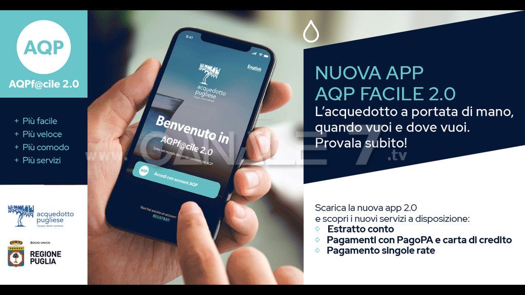 COMUNICATO - Si chiama 2.0 la nuova app di Acquedotto Pugliese: un modo ancora più facile, comodo e veloce per fruire online di tutti i servizi dedicati ai clienti. Oltre alle funzioni di autolettura, simulazione fornitura e consumi, fattura online e prenotazione appuntamenti, da oggi è possibile effettuare l’estratto conto, con l’evidenza delle attività di recupero crediti, e i pagamenti, anche delle singole rate, attraverso i canali PagoPA e carta di credito. Uno strumento innovativo e integrato a servizio del cliente, disponibile anche in lingua inglese. Il tutto standosene comodamente a casa propria, senza doversi recare presso gli sportelli commerciali ed evitando i luoghi affollati.