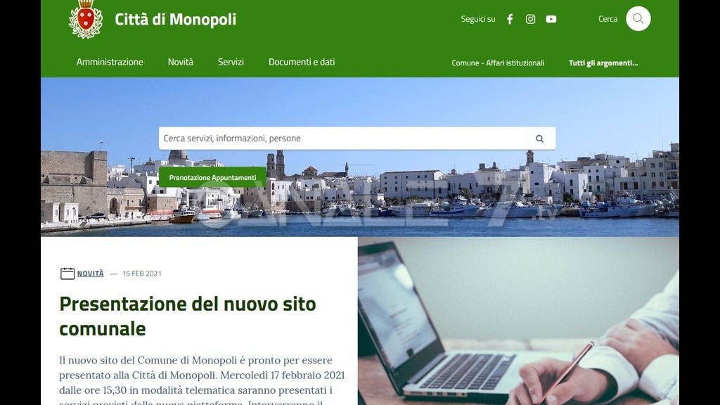 MONOPOLI E’ online da ieri mercoledì 17 febbraio 2021 il nuovo sito web del Comune. La presentazione è avvenuta in conferenza stampa da remoto. I servizi offerti dalla nuova piattaforma sono stati presentati dal sindaco Angelo Annese e dall’ assessore alla digitalizzazione ed informatizzazione Angela Pennetti. Il sito con grafica e contenuti innovativi è stato realizzato sul modello richiesto dal Team per la Trasformazione Digitale della Presidenza del Consiglio dei Ministri, secondo le nuove linee guida, per un rinnovato approccio tra pubblica amministrazione e cittadino, affinchè l’utenza sia notevolmente facilitata nell’approccio con la tecnologia. Infatti i servizi offerti dalla rinnovata piattaforma pongono in primo piano la possibilità per il cittadino di poter accedere con facilità ai servizi nei vari settori di competenza, per le diverse informazioni in tempo reale e l’importante modulistica da scaricare. I vari servizi, come è stato spiegato dal sindaco Annese nella nostra intervista di ieri, sono a portata di click. Ma nel sito non si trova soltanto questa materia fondamentale per l’utenza, ci sono infatti diversi spazi per le informazioni sull’ente, sul governo, sul consiglio comunale, i vari settori dirigenziali, con cui è possibile interagire. C’è anche un ampio spazio per la vita cittadina, con una bacheca in cui sono evidenziati, iniziative, eventi e appuntamenti.