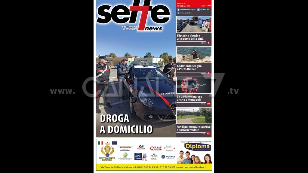 E’ in edicola Sette News. In copertina “Droga a domicilio” . E’ ai domiciliari ma si fa comunque portare droga a casa: torna in carcere 38enne monopolitano. Ai militari dell’Arma della Compagnia monopolitana il plauso dei residenti della zona. All’interno “Discarica abusiva alle porte della città”. La Polizia Locale scova mega discarica abusiva alle porte della città: due denunce. E’ in un’area di circa 1700 metri quadri dove gli agenti hanno trovato anche rifiuti speciali. “Cedimento scoglio a Porto Bianco”. Un pezzo di scoglio ha ceduto ed è finito in mare a Porto Bianco. Si tratta di un cedimento naturale di un tratto esterno della scogliera delle caletta . “ La variante inglese anche a Monopoli”. Positivi in aumento in città. Siamo a quota 87. Fra loro individuati 5 cittadini con la variante inglese. “ Fondi per strutture sportive a Parco Belvedere”. Si tratta di fondi per 20mila euro. Il progetto candidato a finanziamento per l’Avviso Pubblico Sport e Salute Spa- Anci. In questo numero ampie pagine di cronaca, politica, attualità, sport, rubriche e appuntamenti. Sette News è in tutte le edicole di Monopoli.