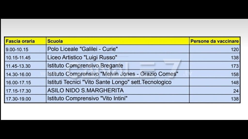 MONOPOLI - Venerdì prossimo 5 marzo il mondo della scuola completerà la somministrazione della prima dose di vaccino presso la tensostruttura di via Benedetto Croce ( nei pressi dello stadio Veneziani). Dalle 9.00 alle 19.00 l’equipe del dott. Ricci della Asl Bari provvederà ed effettuare la vaccinazione di 900 unità, 899 per la precisione, del personale docente e non docente, dall’asilo nido comunale “ S. Margherita”, quindi gli istituti comprensivi “ Vito Intini – Vincenza Sofo”, “ Melvin Jones- Orazio Comes” e Carolina Bregante- Alessandro Volta”, quindi gli istituti di istruzione superiore, Polo Liceale “Galileo Galilei”, Istituti Tecnici Vito Sante Longo e Liceo Artistico-Musicale e Ipsiam “Luigi Russo”.