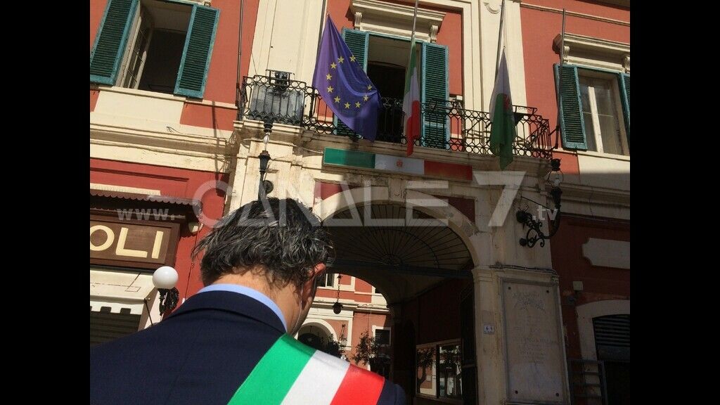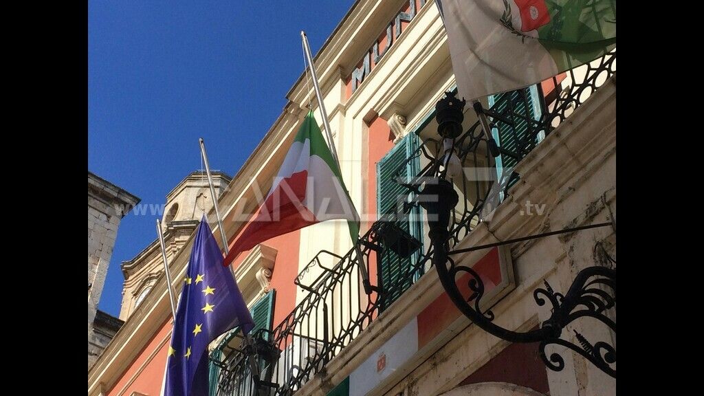 Bandiere a mezz'asta per ricordare chi non ce l'ha fatta nella battaglia contro il Covid. Un minuto di raccoglimento e di preghiera davanti a palazzo di Città.