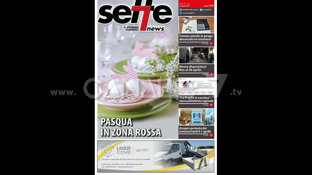E’ in edicola Sette News. In copertina “ Pasqua in zona rossa”. Feste pasquali in zona rossa. Per il nuovo decreto l’Italia resta in zona rossa o arancione sino al 30 aprile. All’interno “ Fumano spinello in garage: denunciate tre minorenni”. Tre minorenni segnalate dalla Polizia. Gli agenti attratti dal forte odore di marjuana mentre effettuavano controlli. “ Nuove disposizioni fino al 30 aprile”. Nessuna apertura al momento per bar e ristoranti, ma se la curva contagi scende c’è qualche speranza. Intanto si torna a scuola sino alla prima media. “ La Puglia ti vaccina: nuova piattaforma regionale”. Partite le adesioni per i nati negli anni dal 1942 al 1945, con la piattaforma regionale creata per agevolare la campagna di somministrazione. “#ioapro protesta dei commercianti il 7 aprile”. Imprenditori del commercio in piazza Vittorio Emanuele per una protesta pacifica. Per l’iniziativa nazionale #ioapro, titolari e commessi il 7 aprile dimostreranno il loro disagio. In questo numero ampie pagine di cronaca, politica, attualità, sport, rubriche e appuntamenti. Sette News è in tutte le edicole di Monopoli.