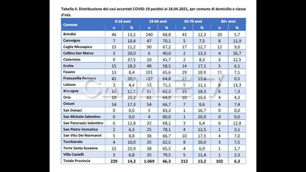 FASANO - Contagi in calo e vaccinazioni in aumento. Due buone notizie che spingono ad avere fiducia. Sono 154 i casi di Covid-19 a Fasano. Lo ha comunicato oggi la Asl nel consueto bollettino settimanale. Il numero dei contagi è nettamente diminuito rispetto a sette giorni fa. La curva segna così la tanto sperata flessione. Nello specifico, analizzando i numeri degli attualmente positivi, a Fasano sono 13 (pari al 8,4%) nella fascia di età tra gli 0 e i 18 anni, 101 (pari al 65,6%) tra i 19 e i 64 anni, 29 (pari al 18,8%) tra i 65 e i 79 anni e 11 (pari al 7,1%) oltre gli 80 anni.