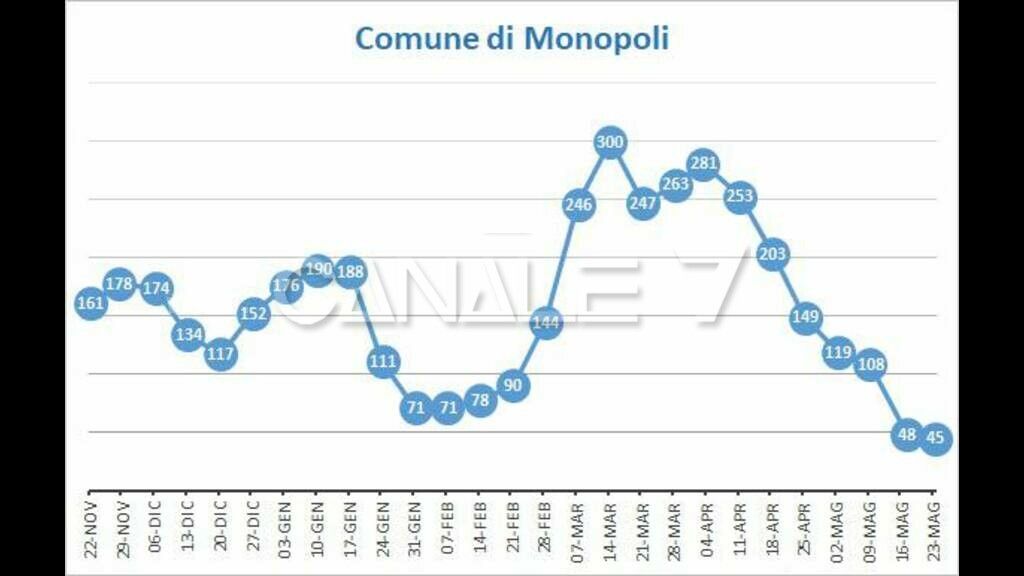 Dal suo profilo Facebook il sindaco di Monopoli, Angelo Annese, aggiorna sui dati epidemiologici in città. “ Il dato aggiornato dei contagiati – scrive Annese- dice che nostra città registrano 45 persone positive al Covid. Si tratta di 27 donne e 18 uomini. 1 da 0 a 10 anni; 6 da 11 a 20 anni; 6 da 21 a 30 anni; 3 da 31 a 40 anni; 8 da 41 a 50 anni; 10 da 51 a 60 anni; 3 da 61 a70 anni; 6 da 71 a 80 anni; 2 da 81 a 90 anni. L’età media dei contagiati è di 46 anni. I cittadini in isolamento sono 14. Questa settimana non leggiamo un grande cambiamento- sottolinea il primo cittadino- il dato è calato molto lievemente in 7 giorni. Leggo con speranza però- conclude- il calo dei cittadini in isolamento è sceso da 34 a 14".