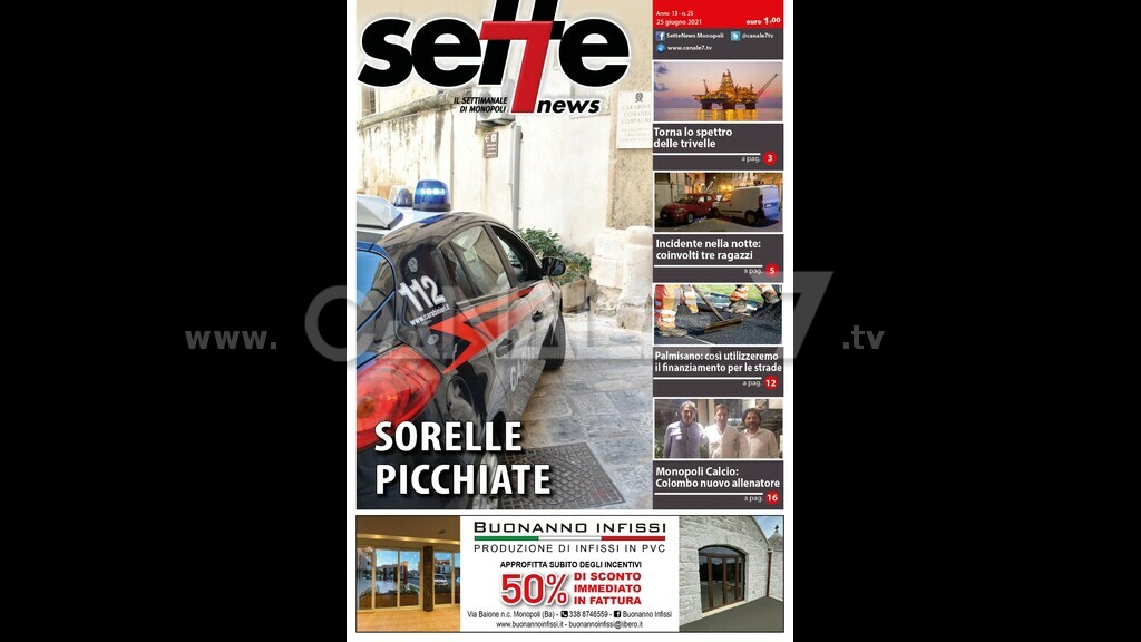 E’ in edicola Sette News. In copertina “Sorelle picchiate”. Picchia la compagna e la sorella di quest’ultima: arrestato dentista materano. Vittime due giovani monopolitane: i carabinieri si fingono pazienti per notificare l’ordinanza cautelare. All’interno “Torna lo spettro delle trivelle”. Torna lo spettro delle trivelle nel nostro mare. La Corte di Giustizia Europea ha dato torto alla Regione Puglia. “ Incidente nella notte: coinvolti te ragazzi”. Incidente in pieno centro: giovane in ospedale. Una mancata precedenza la probabile causa del sinistro accaduto in piena notte. “ Palmisano: così utilizzeremo il finanziamento per le strade”. Strada per strada: saranno rifatte le vie d’accesso alla città. L’assessore Palmisano spiega come sarà utilizzato il finanziamento di un milione di euro. “Monopoli Calcio: Colombo nuovo allenatore”. Il nuovo allenatore ha firmato un contratto per un anno con opzione. In questo numero ampie pagine di cronaca, politica, attualità, sport, rubriche e appuntamenti. Sette News è in tutte le edicole di Monopoli.