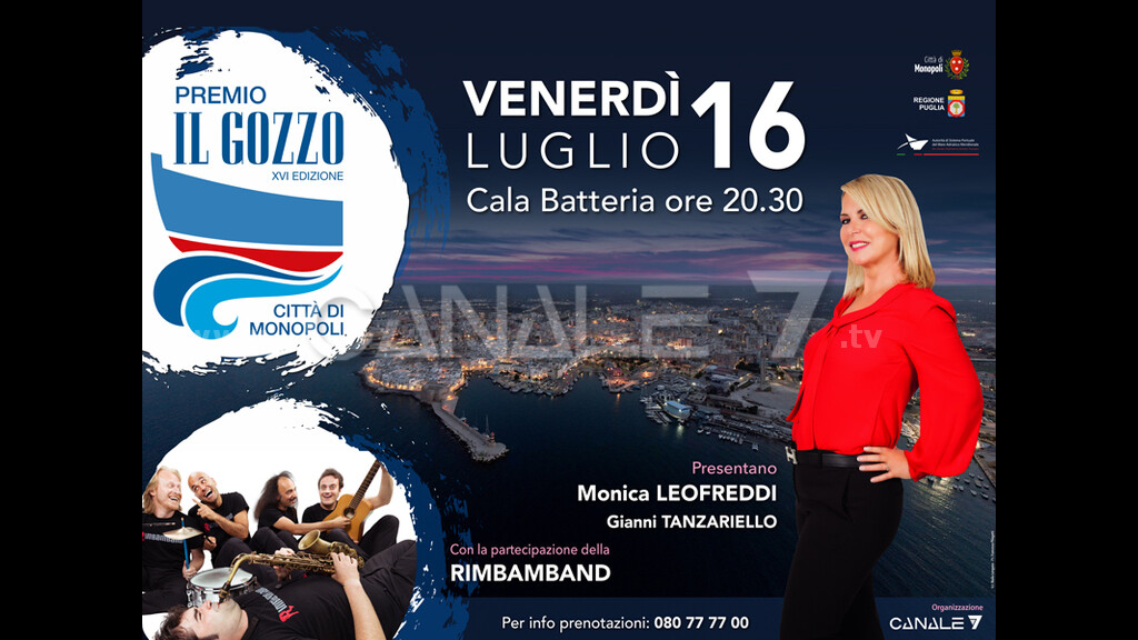 Torna il Premio "Il Gozzo" Città di Monopoli. Dopo lo stop del 2020 dovuto all'incertezza per l'emergenza sanitaria l'evento che premia le eccellenze pugliesi torna il 16 luglio per la sua 16esima edizione. La serata sarà condotta da Gianni Tanzariello direttore artistico e patron dell'evento affiancato da Monica Leofreddi conduttrice di grande esperienza ed eleganza. Per anni volto del pomeriggio di Rai 2 e opinionista in numerose trasmissioni Rai. L' intrattenimento sarà affidato alla Rimbamband che interverrà durante la serata con tre momenti di spettacolo e un mix di musica e cabaret. L'ingresso sarà gratuito e fino ad esaurimento posti ma sarà necessaria la prenotazione a partire dal 6 luglio prossimo. I dettagli per le prenotazioni saranno disponibili sui canali social (facebook e instragram) @premioilgozzo.