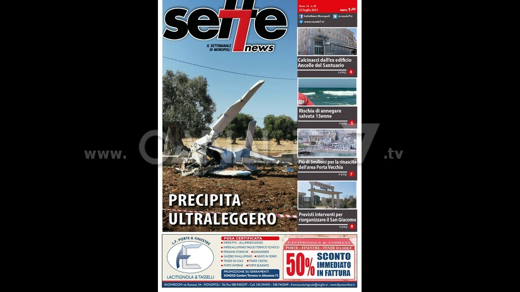 E’ in edicola Sette News. In copertina “ Precipita ultraleggero”. Tragedia aerea nelle campagne tra Fasano e Monopoli: due morti. Precipitato piccolo areo in contrada Coccaro: morti pilota e allievo. All’interno “ Calcinacci dall’ex edificio Ancelle del Santuario”. Cadono calcinacci da quella che fu la sede d’istituto Ancelle del Santuario: tragedia sfiorata. Sul posto sono dovuti intervenire i Vigili del Fuoco e Polizia Locale. “ Rischia di annegare, salvata 13enne”. Una bambina di 13 anni è stata salvata da un bagnino e due bagnanti. Sono intervenuti i sanitari del 118 e personale della Capitaneria di Porto. “ Più di 3 milioni per la rinascita dell’area Porta Vecchia”. Fondi nel contesto in cui alla Città Metropolitana di Bari sono tati accordati 45 milioni di euro per il progetto “Qualità dell’abitare” e di qui fondi ai comuni. “Previsti interventi per riorganizzare il San Giacomo”. Il sindaco Angelo Annese ha incontrato il nuovo direttore sanitario del nosocomio, Alessandro Sansonetti. Fra i nuovi servizi l’attivazione di un’area grigia per gestire l’emergenza Covid 19. Anche in questo numero ampie pagine di cronaca, politica, attualità, sport, rubriche e appuntamenti. Sette News è in tutte le edicole di Monopoli.