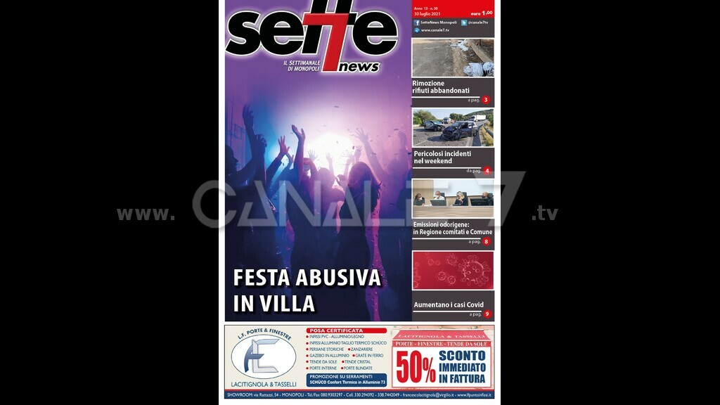 E’ in edicola Sette News. In copertina “Festa abusiva in villa”. La polizia irrompe in una festa con mille persone: quattro denunce. In una villa in contrada Lamalunga deejay, security, bar e catering professionali. All’interno “Rimozione rifiuti abbandonati”. Rimozione di rifiuti abbandonati su spiagge e strade comunali. La giunta regionale approva un contributo di 900 mila euro per i comuni costieri. “Pericolosi incidenti nel weekend”. Diversi incidenti stradali nel fine settimana sulla statale 16. Sulla Gravina e sulla provinciale per Castellana. “ Emissioni odorigene: in Regione comitati e Comune”. Verso un protocollo tra Arpa e Comune per potenziare il monitoraggio e mappare le fonti delle emissioni. “ Aumentano i casi Covid”. Picco di casi al giorno in Puglia. Settimana non promettente. Inoltre uno sguardo alla situazione italiana e mondiale. Anche in città significativo aumento di casi: 27 dopo l’ultimo report del sindaco Annese. Anche in questo numero ampie pagine di cronaca, politica, attualità, sport, rubriche e appuntamenti. Sette News è in tutte le edicole di Monopoli.