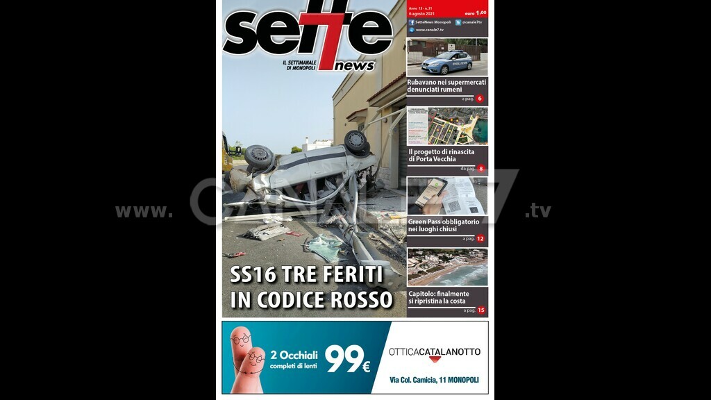 E’ in edicola Sette News. In copertina “ SS 16 tre feriti in codice rosso”. Carambola sulla statale 16 Il sinistro è avvenuto all’altezza di contrada L’Assunta. Documentati in città altri incidenti. All’interno “ Rubavano nei supermercati denunciati tre rumeni. I poliziotti erano stati attratti dai movimenti sospetti di una Ford Focus. “ Il progetto di rinascita di Porta Vecchia”. Il progetto di fattibilità ha ricevuto il finanziamento della Città Metropolitana di Bari. Il sindaco Annese: da settembre il via alla riqualificazione. “ Green pass obbligatorio nei luoghi chiusi. Obbligatorietà dal 6 agosto per ristoranti, piscine e stadi. Vademecum su dove e come utilizzare la certificazione verde. “ Capitolo: finalmente si ripristina la costa”. Finalmente la difesa della costa diventa operativa al Capitolo. Sette Lidi ripristineranno la linea di costa. Anche in questo numero ampie pagine di cronaca, politica, attualità, sport, rubriche e appuntamenti. Sette News è in tutte le edicole di Monopoli.