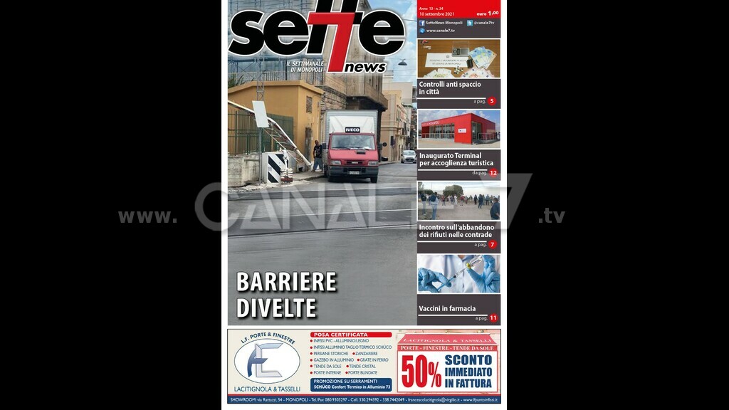 E’ in edicola Sette News. In copertina “ Barriere divelte". Camioncino abbatte il passaggio a livello di Corso Umberto. E ‘accaduto giovedì scorso alla struttura ferroviaria vicina alla stazione. All’interno “ Controlli anti spaccio”. Controlli anti spaccio: in manette due baresi. Diversi interventi dei carabinieri della locale stazione. “ Inaugurato Terminal per accoglienza turistica”. Inaugurato terminal crocieristico nell’ambito del progetto Themis destinato a sostenere lo sviluppo e le attività dei porti minori. “ Incontro sull’abbandono dei rifiuti nelle contrade”. Abbandono rifiuti nelle contrade: i residenti incontrano il sindaco Annese”. Chiesti più controlli ed un potenziamento del servizio. “Vaccini in farmacia”. Vaccini in farmacia: via alle prenotazioni dal 20 settembre. Tutto è pronto per un ulteriore step della campagna vaccinale. Anche in questo numero ampie pagine di cronaca, politica, attualità, sport, rubriche e appuntamenti. Sette News è in tutte le edicole di Monopoli.