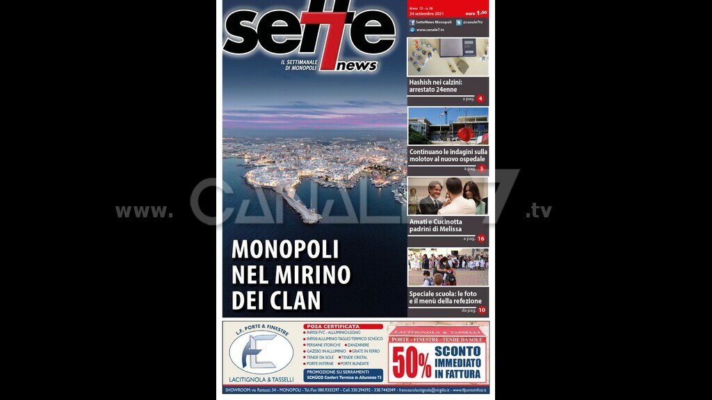 E’ in edicola Sette News. In copertina “ Monopoli nel mirino dei clan”. E’ l’allarme lanciato dal report semestrale della Dia. La crescita turistica e la movida hanno fatto salire l’appetito alla malavita organizzata. All’interno “Hashish nei calzini: arrestato 24enne”. Il giovane è stato catturato nella centralissima via Europa Libera. L’’operazione è stata condotta dagli agenti del locale Commissariato.” Continuano le indagini sulla molotov al nuovo ospedale”. Nuovo ospedale: indagini sull’atto intimidatorio e Amati condanna l’episodio. I Carabinieri della Compagnia di Monopoli alla ricerca dell’autore del vile gesto. “ Amati e Cucinotta padrino e madrina di Melissa”. La piccola Melissa Nigri ha ricevuto il battesimo padrino il consigliere regionale Fabiano Amati e madrina l’attrice Maria Grazia Cucinotta. “Speciale scuola: le foto e il menù delle refezione”. Prima campanella per gli alunni delle scuole primarie cittadine. Anche in questo numero ampie pagine di cronaca, politica, attualità, sport, rubriche e appuntamenti. Sette News è in tutte le edicole di Monopoli.