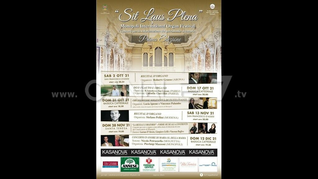 Si terrà sabato prossimo 2 ottobre 2021, alle ore 20.30 presso la chiesa di San Francesco d'Assisi in Monopoli, il concerto inaugurale della rassegna "SIT LAUS PLENA" - Monopoli international organ festival, che si snoderà in 6 imperdibili appuntamenti, fino al 21 dicembre 2021, tra la Basilica Santuario di Maria SS. della Madia, la chiesa di San Francesco d'Assisi e la chiesa di San Pietro e Paolo in Santa Teresa.