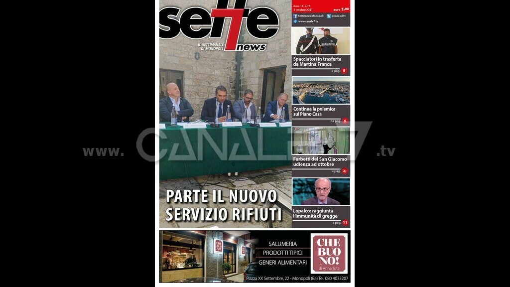 E’ in edicola Sette News. In copertina “ Parte il nuovo servizio rifiuti”. Presentato il nuovo servizio unitario di igiene urbana in ambito Aro/Ba8: Monopoli, Conversano, Polignano a Mare e Mola di Bari, per superare il 70% di differenziata . All’interno “ Spacciatori in trasferta da Martina Franca”. In manette due pusher, un 52enne ed un 34enne, entrambi di Martina Franca, sono stati sorpresi dai carabinieri di Monopoli a confezionare le dosi di cocaina destinate alle piazze di spaccio della provincia. “Continua la polemica sul Piano Casa”. Il Piano Casa prorogato sino a fine 2022, ma è scontro tra Amati e Lacatena. Il presidente della Commissione Bilancio regionale intende abrogare l’emendamento presentato dai forzisti a luglio. “ Furbetti del San Giacomo” udienza ad ottobre”. Saranno 46 gli indagati che si presenteranno davanti al giudice per l’udienza preliminare. “Lopalco: raggiunta l’immunità di gregge”. Vaccinato l’ 81,59% dei pugliesi: per Lopalco raggiunta l’immunità di gregge. La nostra regione tra le più attive sul territorio nazionale nella campagna vaccinale. Anche in questo numero ampie pagine di cronaca, politica, attualità, sport, rubriche e appuntamenti. Sette News è in tutte le edicole di Monopoli.