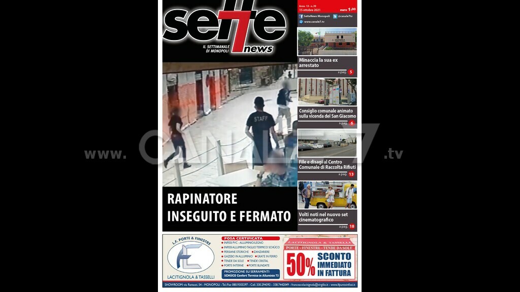 In copertina del nuovo numero di Sette News “ Rapinatore inseguito e fermato”. Rapina una turista straniera ma viene riconosciuto e fermato. Brillante operazione dei carabinieri della locale Stazione. All'interno " Minaccia la sua ex arrestato” “ Codice rosso”: nonostante fosse ai domiciliari vessava e minacciava la sua ex, arrestato. Protagonista un 41enne monopolitano condotto in carcere dagli agenti del locale commissariato. “Consiglio comunale animato sulla vicenda del San Giacomo”. Il consiglio d’infiamma su una domanda “delicata al sindaco Annese. La massima assise cittadina ha approvato tutti punti all’ordine del giorno. “File e disagi al centro comunale di raccolta rifiuti”. Il sistema informatizzato del nuovo servizio di raccolta differenziata prevede la pesatura dei rifiuti. “ Volti noti nel nuovo set cinematografico”. Monopoli nuovamente protagonista sul set cinematografico. Adriano Pappalardo immortalato al Porto Vecchio. Anche in questo numero ampie pagine di cronaca, politica, attualità, rubriche, sport e appuntamenti. Sette News è in tutte le edicole di Monopoli.