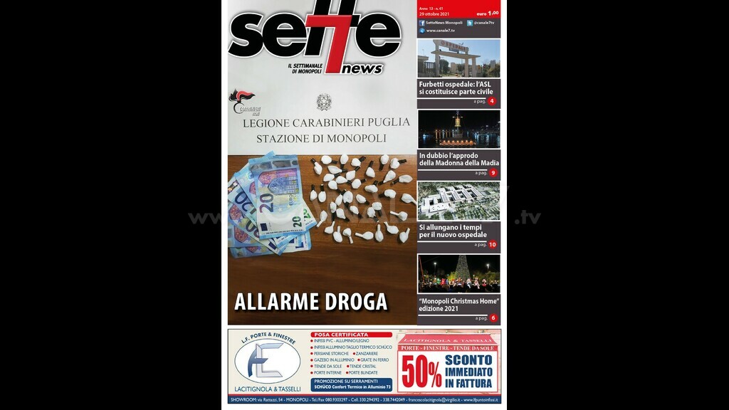 In copertina del nuovo numero di Sette News: “ Allarme droga”. Allarme sociale in città: quattro arresti in due giorni per spaccio di cocaina. Incredibile aumento dell’uso di polvere bianca: diversi gli interventi dei carabinieri. All'interno “ Furbetti ospedale: l’ASL si costituisce parte civile”. Ci si ritroverà nell’aula bunker di Bitonto il prossimo 29 novembre. “In dubbio l’approdo della Madonna della Madia”. Non c’è alcuna certezza sul ritorno dell’approdo della Madonna della Madia il 16 dicembre. Il Vescovo, Mons. Giuseppe Favale dice: Io con il primo a volerla”. “ Si allungano i tempi per il nuovo ospedale”. In audizione in commissione tante cattive e poche buone notizie sul nascente ospedale. “Monopoli Christmas Home “ edizione 2021. In programma un mese di luminarie, mercatini, eventi e spettacoli a partire da martedì 7 dicembre. Anche in questo numero ampie pagine di cronaca, politica, attualità, rubriche, sport e appuntamenti. Sette News è in tutte le edicole di Monopoli.