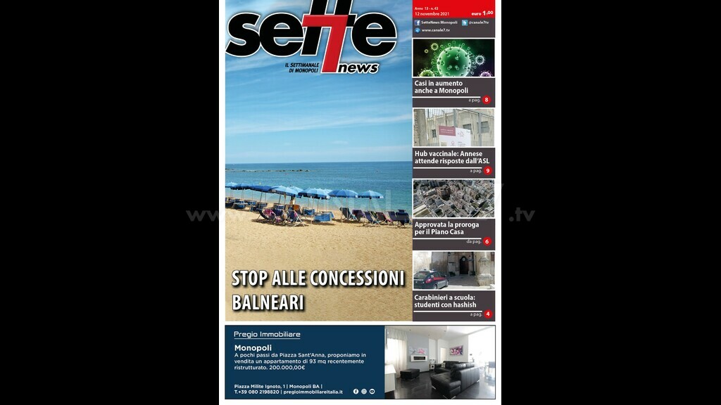 In copertina del nuovo numero di Sette News: “ Stop alle concessioni balneari”. Concessioni prorogate fino a dicembre 2023. Non ci saranno ulteriori proroghe e per le concessioni saranno bandite gare pubbliche. All'interno “ Casi in aumento anche a Monopoli”. Siamo a quota 28 contagi. Il monito del sindaco : “ Prestiamo attenzione e continuiamo a vaccinarci”. “ Hub vaccinale: Annese attende risposte dalla Asl”. Il sindaco ha messo a disposizione soldi e struttura. “ Approvata la proroga per il Piano Casa”. Proroga al 31 dicembre 2022. Esultano i consiglieri, Amati e Lacatena, contraria l’assessore Maraschio. Il gruppo di Forza Italia annuncia una nuova legge sulla rigenerazione urbana semplificata. “ Carabinieri a scuola : studenti con hashish”. I militari trovano hiashish in tasca e negli zaini. I giovanissimi sono stati segnalati come assuntori di sostanze stupefacenti. Anche in questo numero ampie pagine di cronaca, politica, attualità, rubriche, sport e appuntamenti. Sette News è in tutte le edicole di Monopoli.