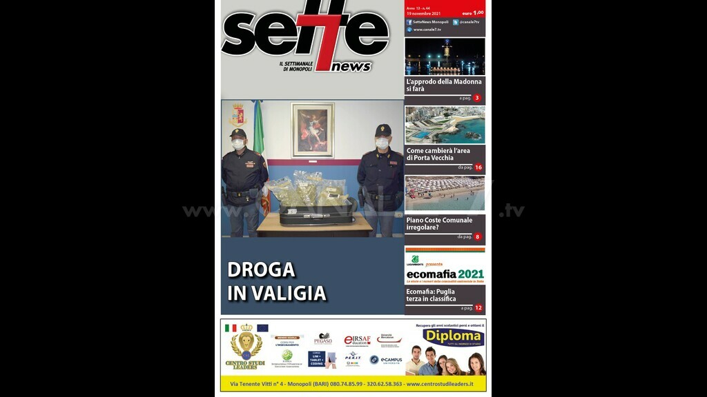 In copertina del nuovo numero di Sette News: “ Droga in valigia”. Quattro chili di droga in valigia : arrestato 50enne fasanese. Il corriere è incappato in un controllo degli agenti del locale commissariato. All'interno “ L’Approdo della Madonna si farà”. Si decide in queste ore la modalità di approdo dell’icona della Madonna della Madia che avrà luogo a Cala Batteria all’alba del 16 dicembre prossimo. “Come cambierà l’area di Porta Vecchia”. L’assessore ai Lavori Pubblici, Gianni Palmisano ha illustrato nella trasmissione Perché? il volto nuovo di Porta Vecchia. Il servizio contiene le foto del progetto di massima del sito cartolina turistica della città. Palmisano ha anche parlato di videosorveglianza e verde pubblico. “Piano coste comunale irregolare?”. Programmare il futuro della costa con poche regole chiare. E’ il punto di vista del Movimento Manisporche dopo la sentenza del Consiglio di Stato che impone una riforma delle concessioni demaniali. “Ecomafia: Puglia terza in classifica”. La nostra regione si conferma purtroppo al terzo posto per le illegalità ambientali. Presentato il rapporto annuale di Legambiente: 3734 le infrazioni in Puglia. Bari, Foggia e Lecce tra le prime dieci in Italia. Anche in questo numero ampie pagine di cronaca, politica, attualità, , sport, rubriche e appuntamenti. Sette News è in tutte le edicole di Monopoli.