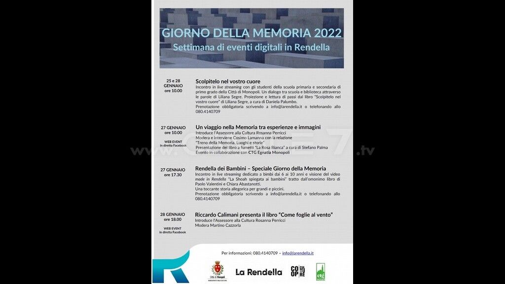 MONOPOLI - L'Assessore alla Cultura e Pubblica Istruzione Rosanna Perricci e la Biblioteca civica “Prospero Rendella” realizzano, in occasione della ricorrenza del Giorno della Memoria che si tiene il 27 gennaio di ogni anno, alcuni eventi digitali dal 25 al 28 gennaio 2022.