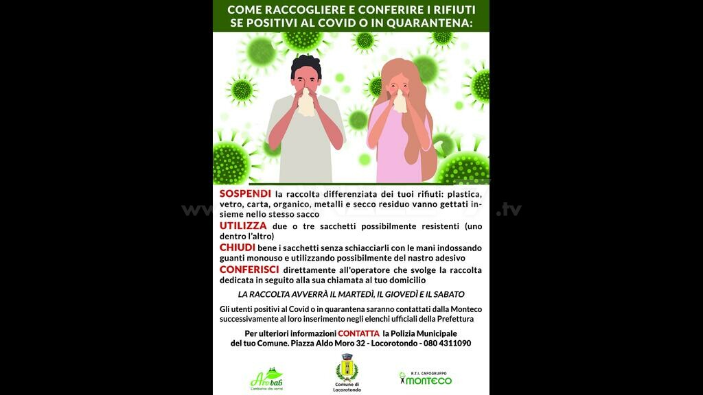 LOCOROTONDO – In relazione alle misure di contenimento del coronavirus si ricorda ai cittadini a seguire alcune semplici regole per raccogliere e gettare correttamente i rifiuti in presenza di cittadini positivi al Covid o in quarantena.
