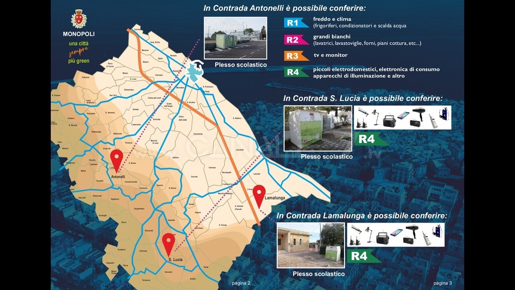 MONOPOLI - Con l’obiettivo di potenziare il servizio di raccolta differenziata nelle contrade. Sono già attive sul territorio dell’agro monopolitano due moduli Mini RAEE nelle contrade Santa Lucia e Lamalunga e un modulo RAEE ecoisola a 4 moduli monolato in contrada Antonelli.