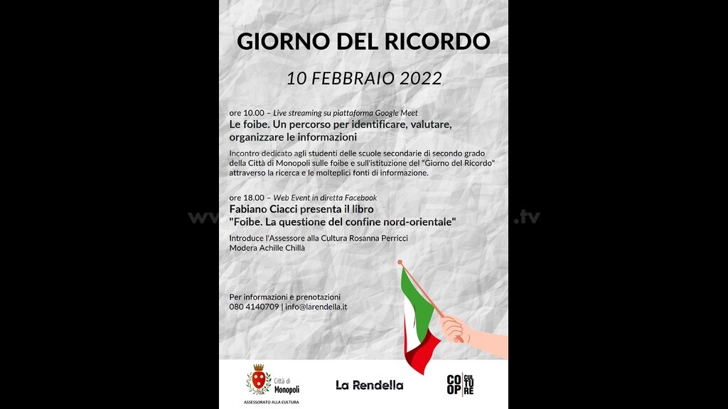 L'argomento indicato con il termine "foibe" va compreso partendo dal complesso e delicato sistema di relazioni esistente tra le diverse etnie che abitavano i territori della Venezia Giulia fin dal lontano '800, inaspritosi poi durante il ventennio fascista e culminato negli eccidi delle foibe e nella diaspora dei giuliano-dalmati. L'Assessorato alla Cultura e Pubblica Istruzione di Monopoli e la Biblioteca civica “Prospero Rendella” hanno organizzato per oggi 10 febbraio in occasione del Giorno del Ricordo che si tiene il 10 febbraio di ogni anno, due eventi digitali. Un servizio nel telegiornale.