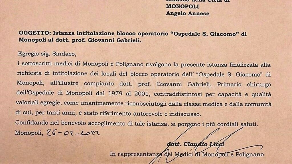 MONOPOLI - Intitolazione del blocco operatorio dell’ospedale S. Giacomo al prof. Giovanni Gabrieli, scomparso lo scorso anno, che per un ventennio dal 1979 aveva creato presso l’U.O.C. del nosocomio monopolitano un punto di riferimento e di scuola di alta chirurgia. Ma il professor Gabrieli oltre agli altri meriti professionali, a livello nazionale ed internazionale, noto per le sue doti umane. Per i suoi meriti nel 2010 su segnalazione dell’allora sindaco Emilio Romani, al dott. Giovanni Gabrieli fu conferito il Premio Città di Monopoli. Il dottor Claudio Licci a nome dei medici di Monopoli e Polignano ha perorato la causa, investendo della richiesta d'intitolazione il sindaco Angelo Annese. Un servizio nel Tg7.