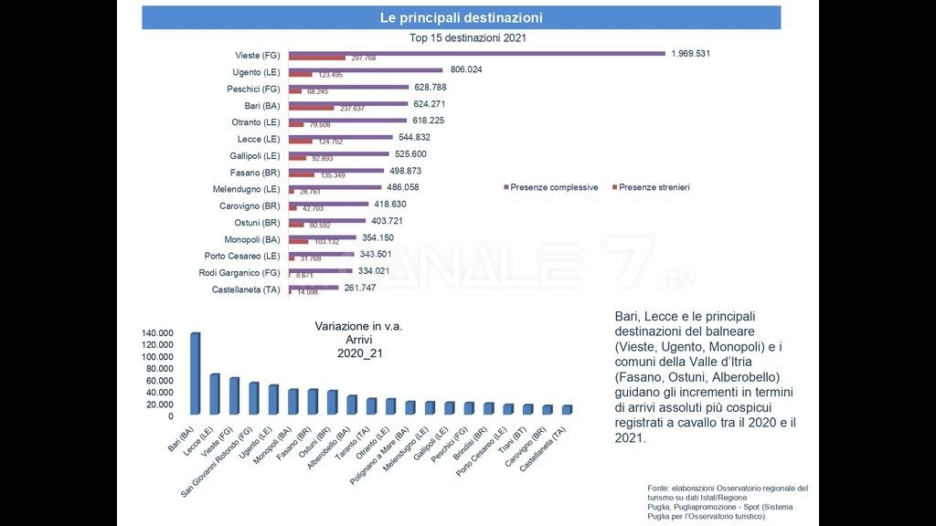 La Puglia turistica giunge al termine dei due anni di pandemia con risultati soddisfacenti. Nel 2021 si sono registrati 3,3 milioni di arrivi e 13,8 milioni di presenze con una variazione rispetto al 2019 del -22% e del -10% (921.600 arrivi e 1.565.000 presenze in meno). Il turismo domestico e nazionale, in ripresa nei mesi estivi, ha consentito di compensare le perdite derivanti dai mesi di lockdown e dalla contrazione del turismo business e internazionale (-48% gli arrivi e -40% le presenze dal 2019 al 2021). Nell'estate 2021 il trend è stato ancor più positivo che nel 2019, anno record. Da luglio a settembre, arrivi e presenze sono aumentati del +5,7% e del 7,5% rispetto all’estate pre-pandemia, trainati dai flussi nazionali che hanno registrato +14,7% e +13,6%.