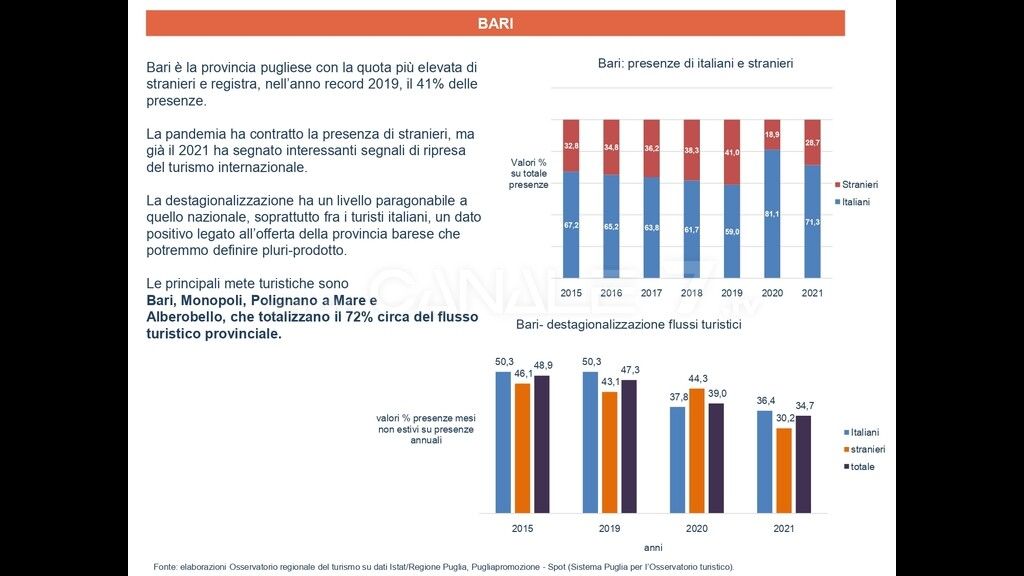 In provincia di Bari la destagionalizzazione ha un livello paragonabile a quello nazionale, soprattutto fra i turisti italiani, un dato positivo legato all’offerta della provincia barese. Le principali mete turistiche sono Bari, Monopoli, Polignano a Mare e Alberobello, che totalizzano il 72% circa del flusso turistico provinciale.