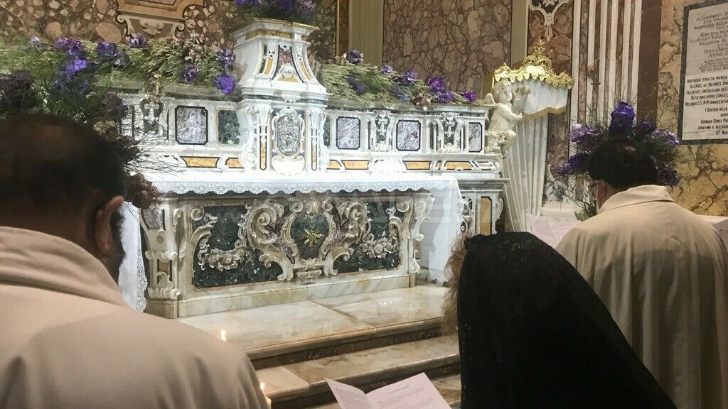 Con la celebrazione “ In Coena Domini” e l’esposizione dell’Eucaristia attraverso gli “Altari della Reposizione”, detti comunemente e impropriamente specie al sud “Sepolcri”, nel Giovedì Santo sono entrati nel vivo i riti della settimana santa. Nella celebrazione In Coena Domini, in un’area diversa dal “Tabernacolo”, l’altare destinato a conservare le ostie consacrate viene allestito questo particolare spazio, destinato ad accogliere, le ostie consacrate, e a conservarle sino al pomeriggio del Venerdì Santo. L’Eucaristia verrà distribuite ai fedeli per la comunione sacramentale, al termine della liturgia penitenziale. I fedeli, al termine della liturgia In Coena Domini, per tradizione si sono recati in pellegrinaggio verso gli altari della reposizione allestiti nelle chiese cittadine. Nelle immagini, in particolare, vediamo il pellegrinaggio di ieri sera a Monopoli presso la basilica Cattedrale, San Francesco d’Assisi, San Francesco da Paola e Santa Teresa al centro storico. La tradizione popolare dice che se ne devono visitare in numero dispari. In particolare l'usanza diche che ogni fedele ne visiti da cinque (quante sono le piaghe di Cristo) a sette (quanti sono i dolori della Madonna). Oggi, venerdì santo, si è nella giornata più importante della Passione e Morte di Gesù Cristo. Canale7 seguirà le fasi clou della giornata in diretta. Alle 15.00 la celebrazione penitenziale del Venerdì Santo dalla parrocchia SS Trinità in S. Francesco da Paola. Alle 19.30, sempre in diretta, il rito della Via Crucis, con il ritorno dopo due anni per l’emergenza Covid, della tanto attesa processione dei Misteri.