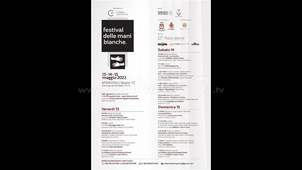 MONOPOLI- “Festival Delle Mani Bianche”. Una tre giorni di dibattiti, teatro, cinema, workshop formativi, mostre, improntata alla sensibilizzazione e alla diffusione della cultura antimafia. L’evento si terrà dal 13 al 15 maggio presso Spazio 12 in via Eugenio Montale 12/14. La presentazione è avvenuta nella sala consiliare “Ignazio Perricci” . Sono intervenuti la presidente del Consiglio della Regione Puglia Loredana Capone, l’Assessora alla Cultura e alla Pubblica Istruzione Rosanna Perricci, la vicepresidente del Collettivo Teatro Prisma e ideatrice della manifestazione dott.ssa Barbara Grilli e per Spazio 12 Angela Vitto. Un servizio nel telegiornale.