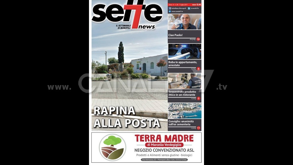 Centrale in copertina: Rapina alla posta banditi armati hanno fatto irruzione nell’ufficio postale in contrada Cozzana; di lato, Ciao Paolo, il saluto di cuore al nostro amico e collega che ci ha lasciati all’improvviso; Ruba in appartamento arrestato ha rubato in contrada Capitolo ed è stato poi arrestato a Bari; Sequestrato prodotto ittico in un ristorante i cibi sono stati trovati non in ottimo stato di conservazione e senza le relative certificazioni; Consiglio: unanimità sull’ex cementeria la massima assise cittadina ha approvato l’atto di indirizzo per la realizzazione del progetto Solemare.