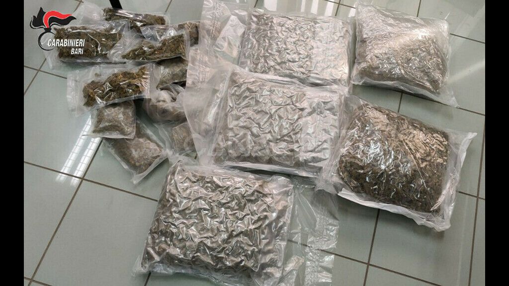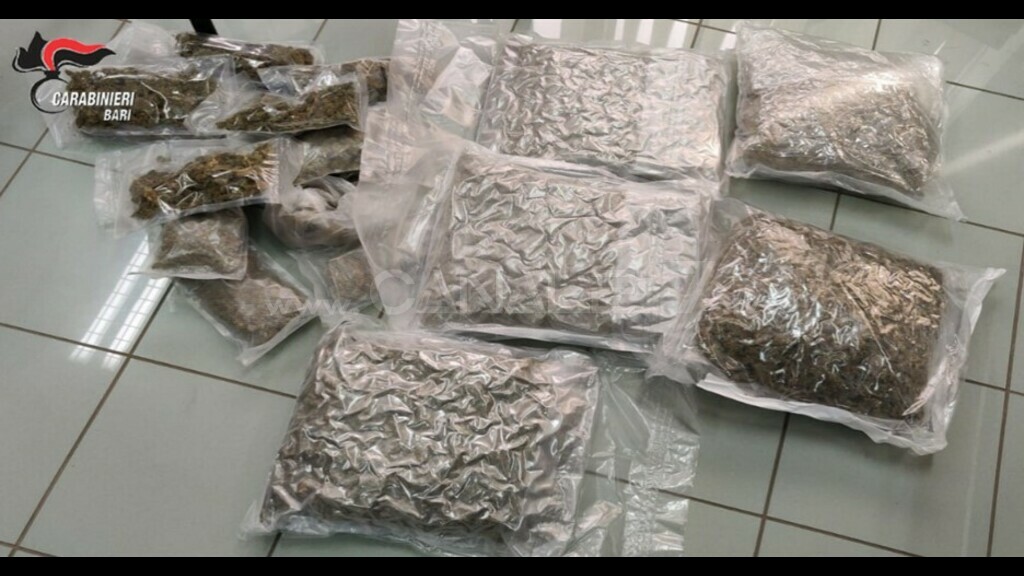 ALTAMURA- Nelle ultime settimane, i Carabinieri del Comando Provinciale di Bari, impegnati su tutto il territorio della città Metropolitana in una serie di servizi volti al contrasto del traffico illecito di sostanze stupefacente, hanno proceduto a diversi controlli nell’area murgiana. Le attività, condotte da militari in divisa supportati da personale in abiti civili, hanno portato all’arresto, in due distinte operazioni, di un 47enne, incensurato del luogo, trovato in possesso di cinque chili e seicento grammi di droga e di una pistola, e di un 35enne, anch’egli del luogo, trovato con quasi sei chili di marijuana.