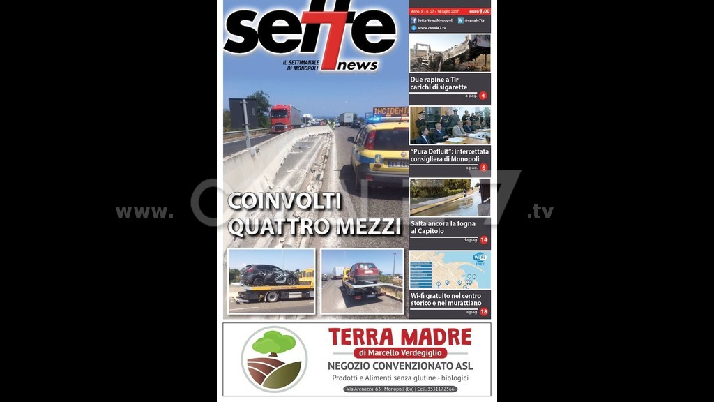 È in edicola SetteNews, il settimanale di Monopoli. Centrale in copertina: Coinvolti quattro mezzi grave incidente sulla statale 16 in cui sono state coinvolte tre auto ed un tir; di lato, cronaca Due rapine a Tir carichi di sigarette uno fallisce l’altro è andato a segno; “Pura Defluit”: intercettata consigliera di Monopoli è la compagna di un noto imprenditore albanese coinvolto nell’indagine; attualità, Salta ancora la fogna al Capitolo uno sversamento a causa del malfunzionamento degli impianti di Acquedotto Pugliese; Wi-fi gratuito nel centro storico e nel murattiano fra qualche giorno la città offrirà questo nuovo servizio. Come di consueto all’interno troverete una ricca pagina di cronaca, approfondimenti sulla politica, l’attualità, la vita in città e naturalmente lo sport con tutte le novità sulle squadre cittadine. Quindi rubriche e appuntamenti. Questo e tanto altro su SetteNews, il settimanale di Monopoli, in tutte le edicole.