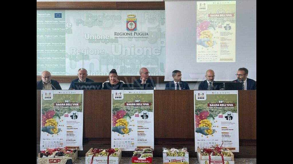 È stata presentata questa mattina 5 ottobre 2022, nella sede dell’Assessorato all’Agricoltura della Regione Puglia, la 58esima edizione della Sagra dell’Uva di Rutigliano, in programma sabato 8 e domenica 9 ottobre 2022, tra piazza XX settembre e piazza Manzoni. Due giornate tra tour esperienziali e gastronomici all’insegna di tradizione, cultura, sport e musica dal vivo. Protagonista indiscussa naturalmente l’uva da tavola.