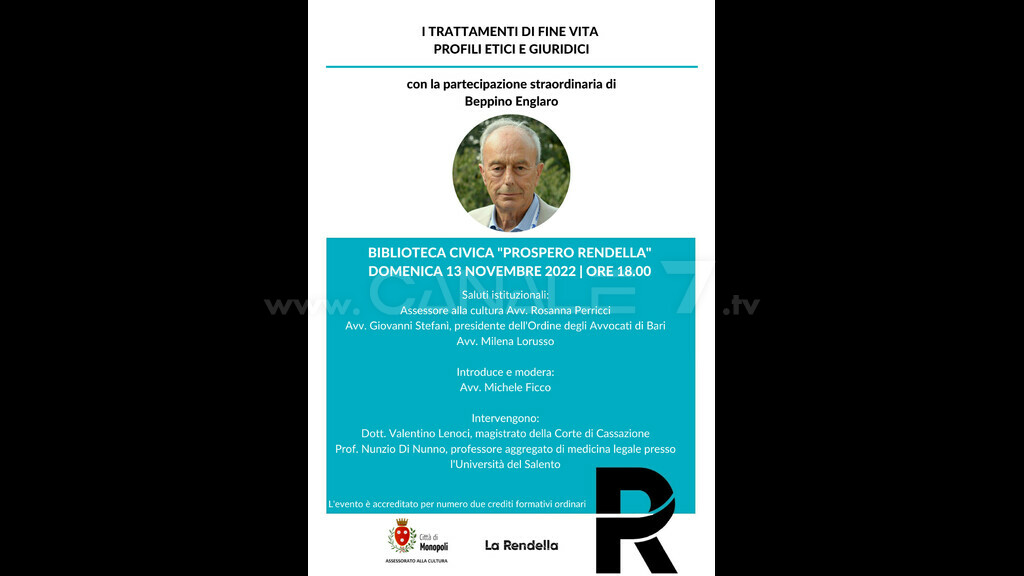 COMUNICATO - L’Assessore alla Cultura del Comune di Monopoli, Rosanna Perricci, comunica che domenica 13 novembre 2022 alle ore 18 nella Biblioteca Civica “Prospero Rendella” si terrà l’incontro “I trattamenti di fine vita. Profili etici e giuridici” con la partecipazione straordinaria di Beppino Englaro.