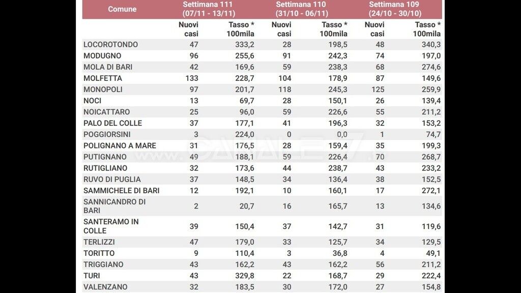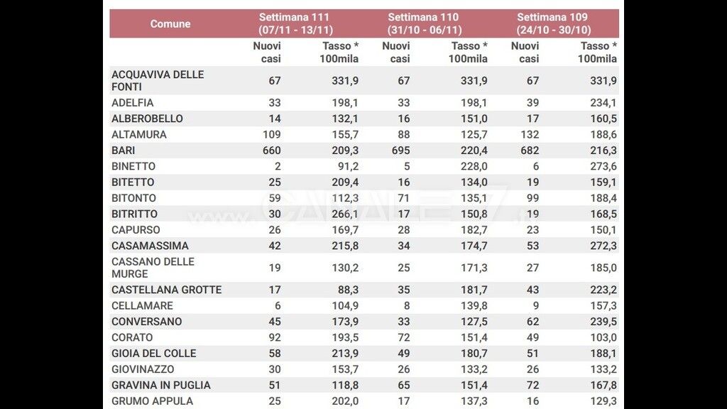 Stazionaria la circolazione del virus Sars Cov 2 nel territorio di Bari e Provincia. Nell’ultimo monitoraggio, il tasso d’incidenza settimanale resta sostanzialmente invariato, con una lievissima differenza (meno 0,3%) rispetto al dato precedente: 185,3 ogni 100mila abitanti contro 185,9, con le nuove positività attestate a quota 2.279 (erano 2.287 sette giorni fa).