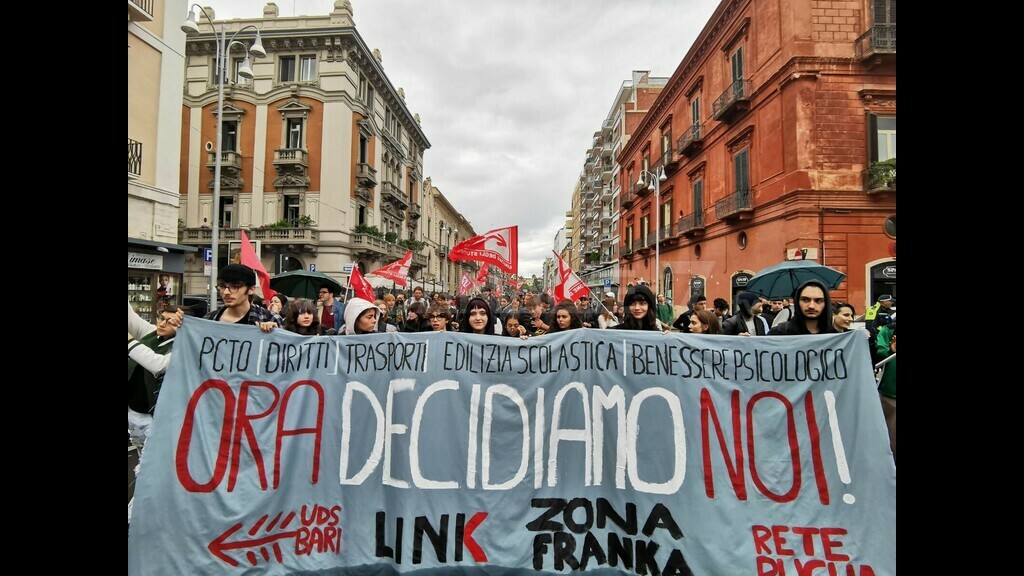 Sono migliaia gli studenti e le studentesse pugliesi che oggi sono scesi oggi venerdì 18 novembre in piazza in occasione della mobilitazione indetta dall’Unione degli Studenti, Link e Rete Puglia. Al centro della protesta la contrarietà al Piano Scuola immaginato dal neo-Ministro Valditara e agli orientamenti sull’istruzione del Governo Meloni, ma non solo. Gli studenti chiedono che le istituzioni regionali e le amministrazioni comunali si attivino per una piena applicazione della legge regionale al diritto allo studio, promuovendo la possibilità da parte degli studenti di usufruire dei servizi essenziali che rendono maggiormente accessibili i percorsi di formazione.