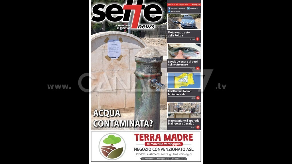 Centrale in copertina: Acqua contaminata, acquedotto pugliese ha proibito l’uso alimentare delle acque potabili in contrada capitolo e Lamandia in attesa del risultato dei campionamenti ASL; di lato, Moto contro auto della Polizia, il centauro 18enne ha perso il controllo del mezzo ed è rimasto lievemente ferito nello scontro; Specie velenose di pesci nel nostro mare, si tratta di alcuni esemplari di pesce palla che sprigionano tossine paralizzanti; In Città sventolano le cinque vele Monopoli era stata premiata con il riconoscimento di Legambiente e parteciperà all’omonimo distretto; Mese Mariano: l’approdo in diretta su Canale 7, anche quest’anno la rete garantirà la possibilità di assistere all’evento religioso a coloro che siano impossibilitatati a raggiungere Cala Batteria.