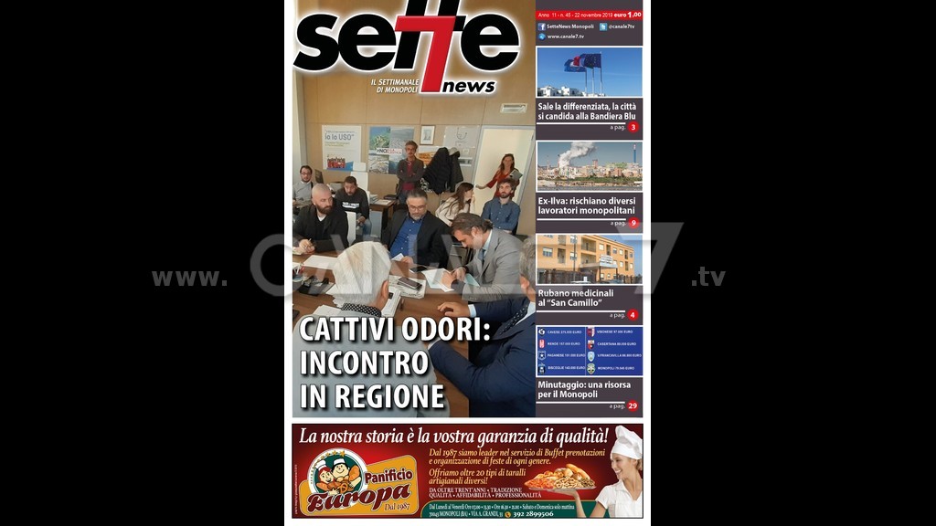 E’ in edicola Sette News, il settimanale di Monopoli. In copertina “ Cattivi odori: incontro in Regione”. Emissioni odorigene: un incontro in Regione con istituzioni e cittadini. E’ stato deciso di ampliare i controlli ai dati industriali e pianificare incontri periodici, la proposta dell’Assessore Regionale all’Ambiente Gianni Stea. All’interno “Sale la differenziata, la città si candida alla Bandiera Blu”. Superato l’obiettivo minimo di differenziata necessario per ottenere il vessillo delle FEE. “ Ex Ilva: rischiano diversi lavoratori monopolitani”. Anche diverse famiglie monopolitane temono per il futuro del siderurgico tarantino. “ Rubano medicinali al S. Camillo”. Ladri al day hospital, rubati farmaci antitumorali. Bottino quantificato in centinaia di migliaia di euro. “ Minutaggio: una risorsa per il Monopoli”. Minutaggio per la squadra di calcio: un socio occulto che al Monopoli regala 80 mila euro. Resi pubblici i primi dati: la Cavese è la squadra con i maggiori introiti. In questo numero ampie pagine di cronaca, politica, attualità, sport, rubriche e appuntamenti. Sette News è in tutte le edicole di Monopoli.